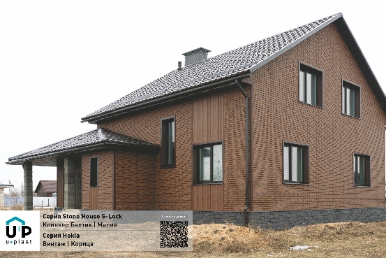 Сайдинг Ю-Пласт Стоун Хаус S-Lock Клинкер Балтик Пустыня используется для отделки наружных стен зданий и декоративных конструкций, внешне имитирует клинкерный кирпич.