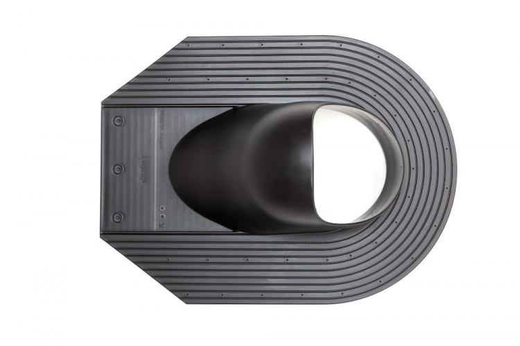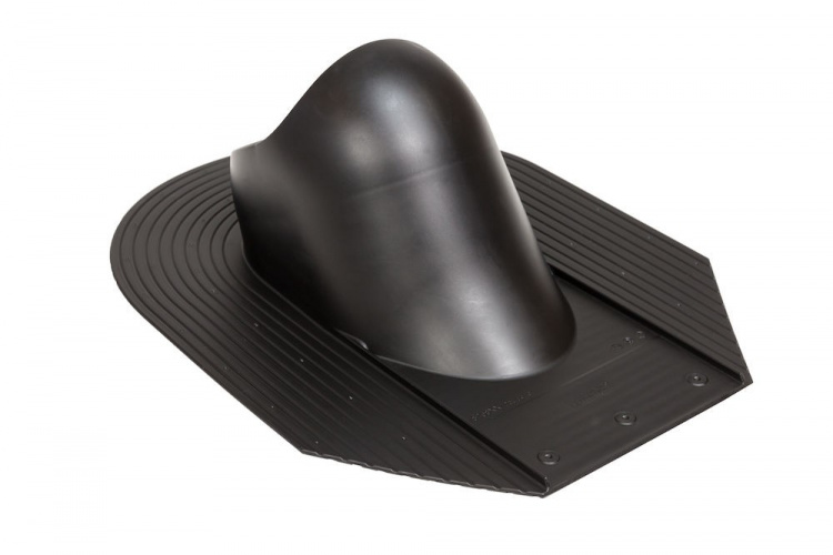 Проходной элемент для скатной битумной и сланцевой кровли. Комплект: проходной элемент, шаблон и набор крепежа. Устанавливается при монтаже кровельного материала.