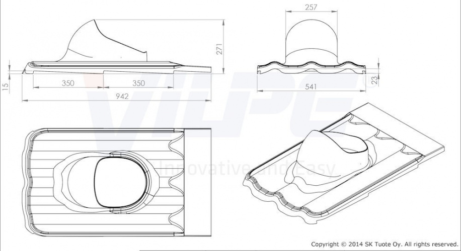 Проходной элемент для металлочерепицы с профилем Monterrey (ширина волны ≈ 183,3 мм, длина профиля min 350 мм, высота профиля ≈ 39 мм). Комплект: XL -проходной элемент, XL -кольцо гидрозатвора, уплотнительная лента (3 шт.), монтажная инструкция и набор крепежа. Устанавливается при монтаже и на готовую кровлю.