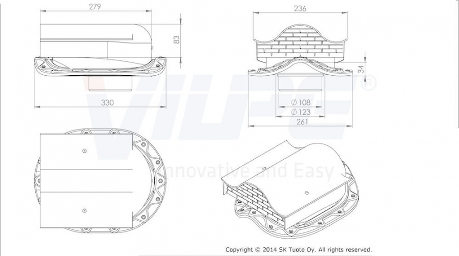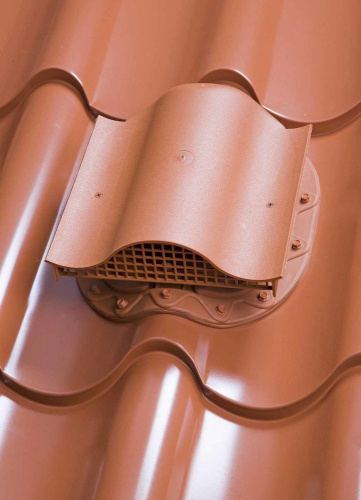 Кровельный вентиль для вентиляции металлочерепицы с профилем Monterrey (ширина волны ≈ 183,3 мм, длина профиля min 350 мм, высота профиля ≈ 39 мм). Комплект: MUOTOKATE -KTV вентиль с наклеенной резиновой прокладкой, кольцо гидрозатвора, инструкция по монтажу кольца гидрозатвора, шаблон, герметик на безуксусной основе, и набор крепежа. Устанавливается при монтаже и на готовую кровлю.
