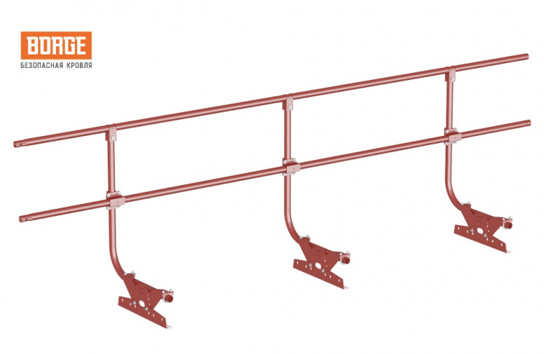 Кровельные ограждения предназначены для обеспечения безопасности людей при передвижении по кровле и предотвращения падения при эксплуатации, ремонте и обслуживании кровли.Состоят из металлических труб на кронштейнах, устанавливаются вдоль карниза и на переходных мостиках. Предназначен для зданий высотой свыше 30 м.