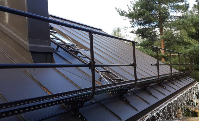 Кровельные ограждения предназначены для обеспечения безопасности людей при передвижении по кровле и предотвращения падения при эксплуатации, ремонте и обслуживании кровли.Состоят из металлических труб на кронштейнах, устанавливаются вдоль карниза и на переходных мостиках.