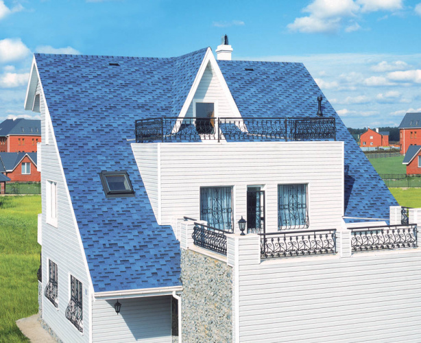 Черепица Голубая Лагуна – яркий представитель коллекции Runa, рассчитанный на благородных покупателей со спокойным темпераментом. Глубокий синий цвет несёт в себе прохладу и умиротворение, способствует размышлениям, создаёт деловую, доверительную атмосферу вокруг дома. Кровля RUNA Голубая Лагуна стилизована под старинную деревянную гонтовую крышу. Высокое сходство достигается благодаря использованию битумных гонтов сложной многоугольной формы, создающих картину покрытия. Важно! Гибкая черепица RUNA Голубая Лагуна продается кратно упаковкам