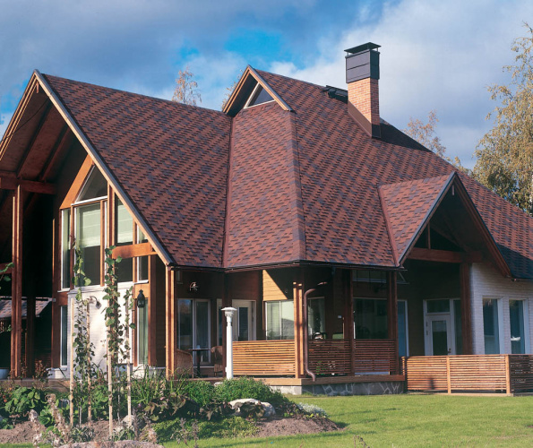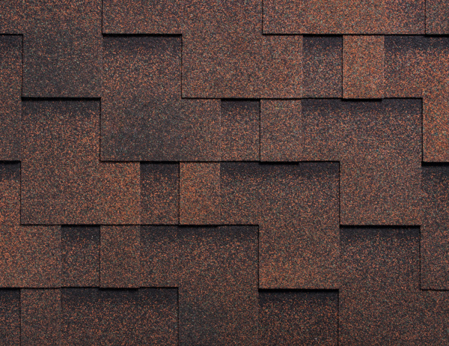 Черепица RUNA Медный отлив - это благородство внешнего вида и налёт времени, которые сочетаются в этом оттенке с прочностью и долговечностью. Спокойный коричневый, красный и тонкие вкрапления зеленого создают неповторимое по своей красоте цветовое решение. Битумные гонты с ярко выраженным медным отливом отличаются оригинальной многоугольной формой. Важно! Гибкая черепица RUNA Медный отлив продается кратно упаковкам