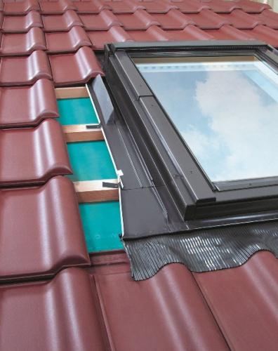 Оклад для профилированных кровельных покрытий позволяет соединить окно с профилированным кровельным материалом: профнастил, черепица, металлочерепица. Может применяться для кровельного материала с высотой профиля до 45 мм. Оклад EZV-P имеет свинцовый фартук.