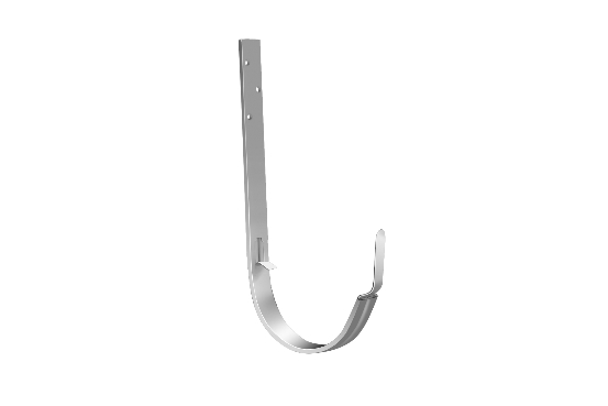 Служит для подвеса желоба на обрешетку, устанавливается до монтажа кровельного материала. Выполнен из оцинкованной стали с покрытием на основе полиуретана. Облегчает монтаж водосточной системы за счет расположения фиксатора с внешней стороны крюка, что позволяет устанавливать желоб и после монтажа кровельного материала.